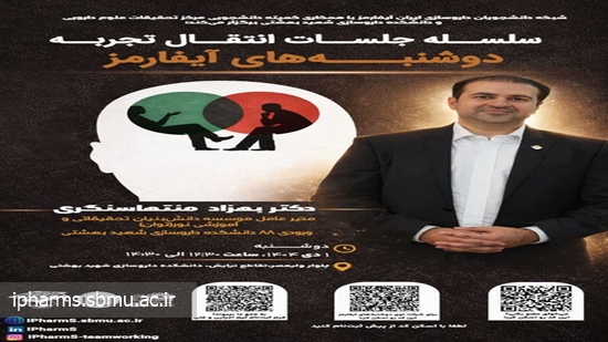 زمان: دوشنبه ۱ دی ۱۴۰۴ ، ساعت: ۱۲:۳۰ الی ۱۴، مکان: تقاطع نیایش و ولیعصر، دانشکده داروسازی شهید بهشتی، سالن کنفرانس ۲
